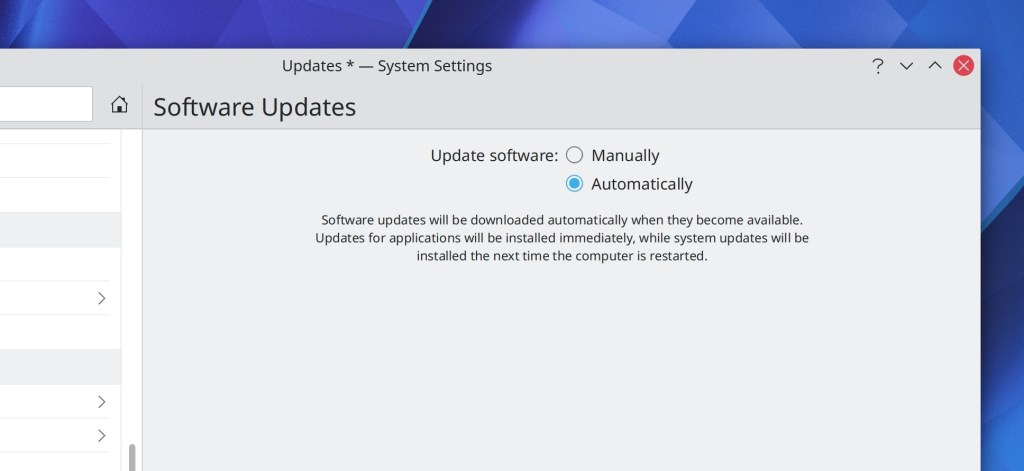 You can now optionally (and it’s off by default) have your system automatically apply available updates (Aleix Pol Gonzalez, Plasma 5.21):