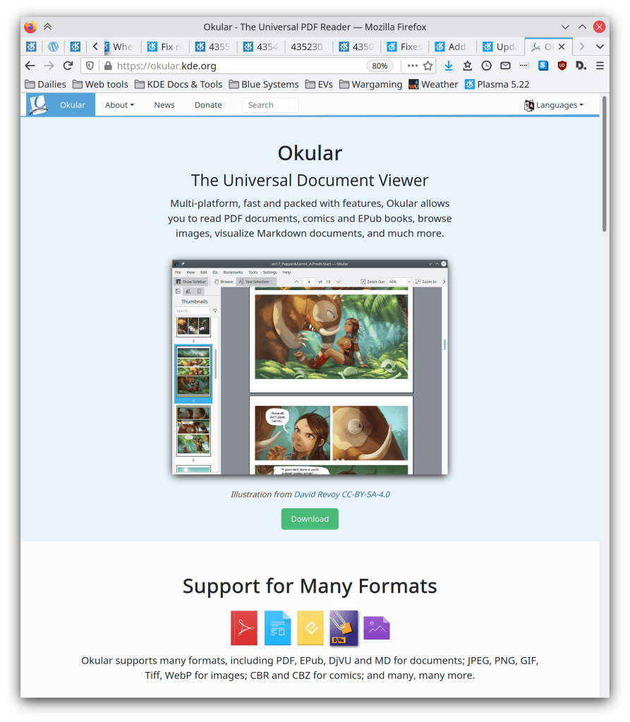 The new Okular website looks very nice. I really like the demo page you have chosen from David Revoy’s comic!