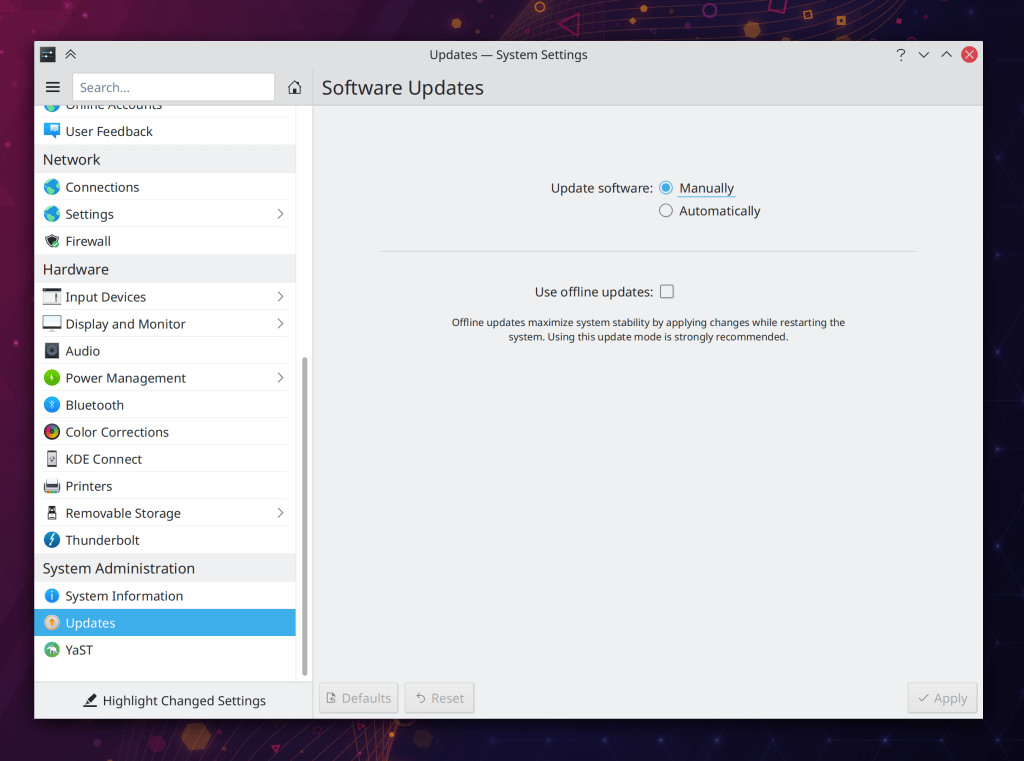 Offline Updates needs a different name. To me that sounds like getting updates from a USB stick, DVD, or some other offline, non-networked source; not applying online, network sourced updates upon reboot (which is a terrific feature to add). The feature is literally “Apply Online Sourced Updates On Reboot” so calling it “Offline Updates” is a bit misleading.