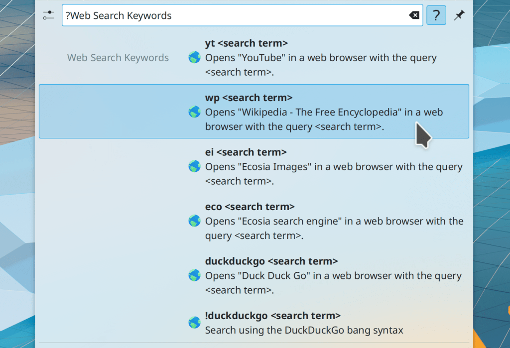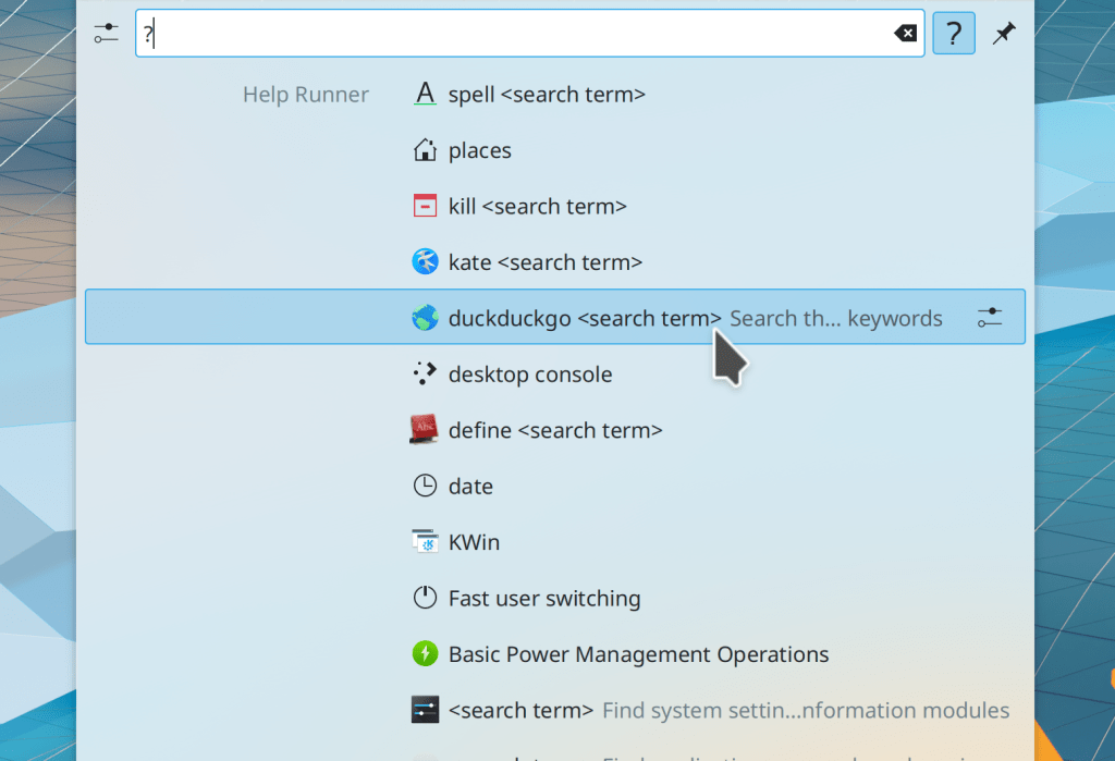 KRunner now has an inline help feature, which you can show by clicking on a new question mark icon on its toolbar or typing “?” And while in Help mode, clicking a particular plugin will show you all the different search syntaxes for it! (Alexander Lohnau, Plasma 5.24)