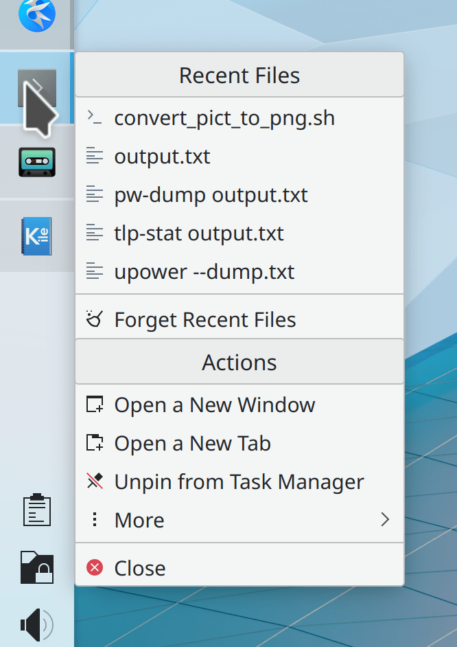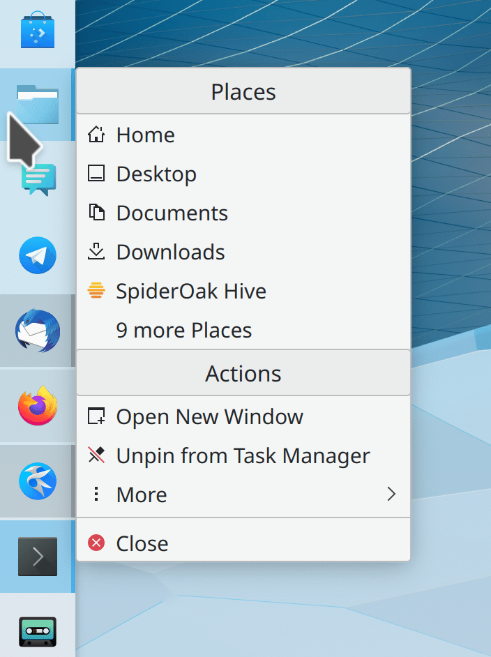 In the Task Manager’s context menu, the “Start New Instance” context item has been renamed to “Open New Window” for clarity and no longer appears for apps marked as having a single main window or that already provide a “New Window” action of their own, and the “More Actions” item has been moved to the bottom and renamed to just “More” (Nicolas Fella and me: Nate Graham, Plasma 5.24):