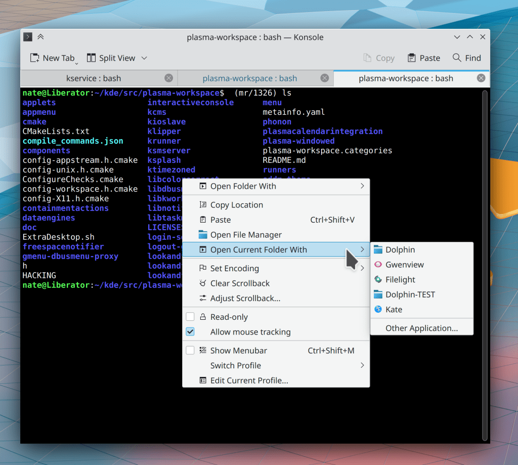 Konsole now lets you open the current directory or any other folder you right-click on in any app, not just the file manager (Jan Blackquill, Konsole 22.04):