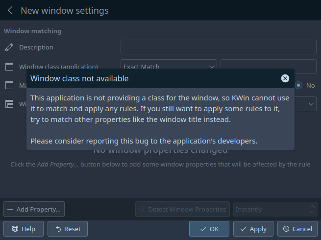 When creating window rules and trying to match windows by their window class, the page will now give you a comprehensible error message when you target a window that doesn’t have a window class (Ismael Asensio, Plasma 5.27. Link):