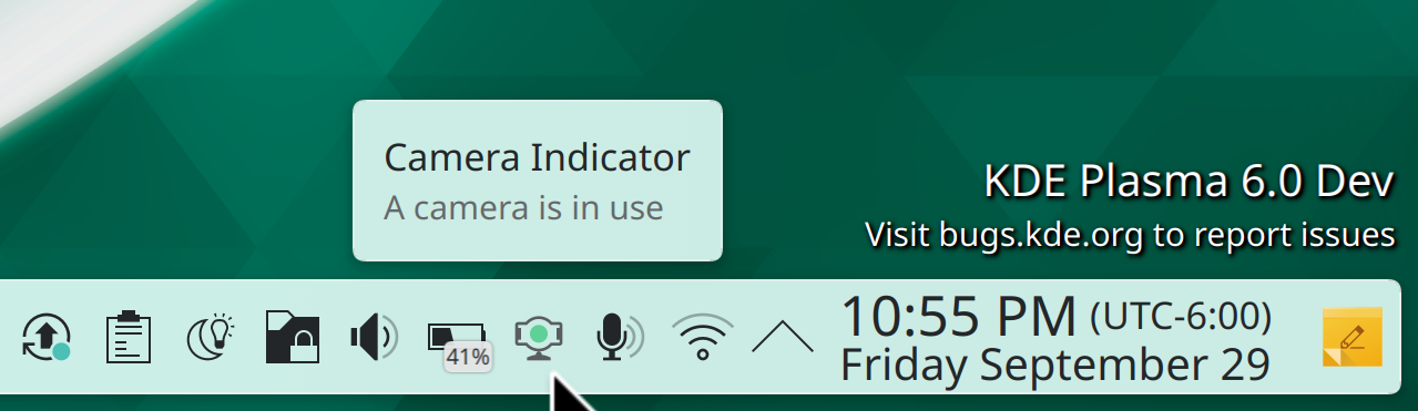 In the Plasma Wayland session, there’s now a System Tray monitor that shows you when something is using the camera, just like we already have for screen recording and microphone usage (Fushan Wen, link 1 and link 2):
