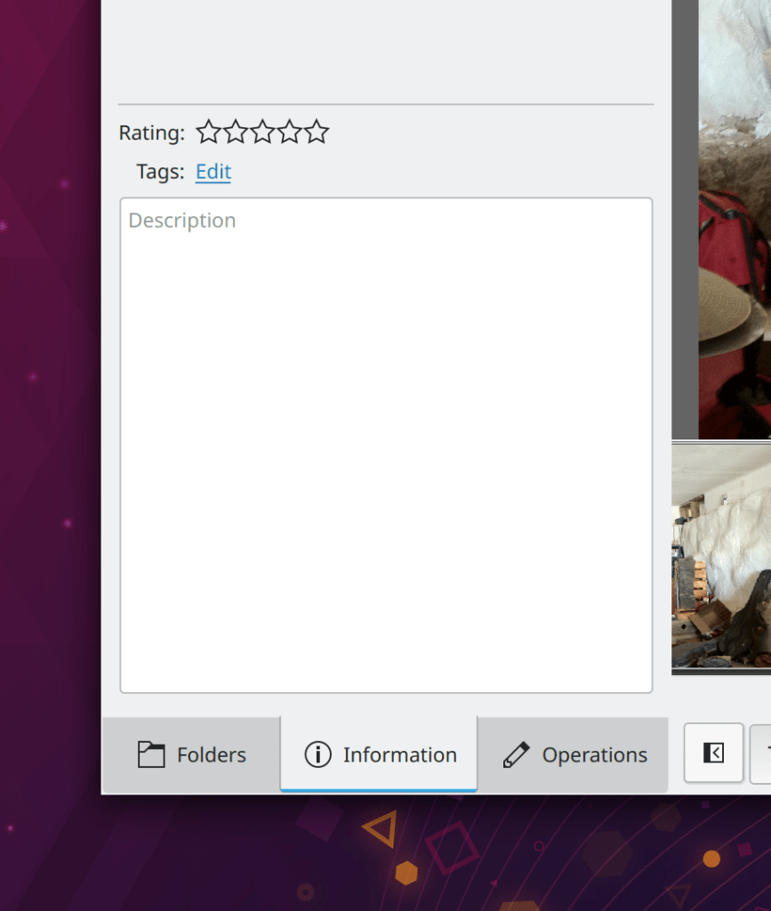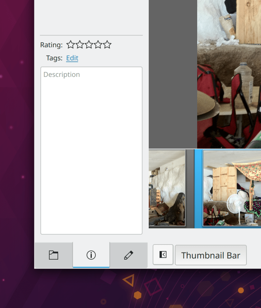 The tabs at the bottom of Gwenview’s sidebar now become icons-only at very small widths where the text would have previously been elided, and become icons+text at very wide widths (Noah Davis, Gwenview 21.08):