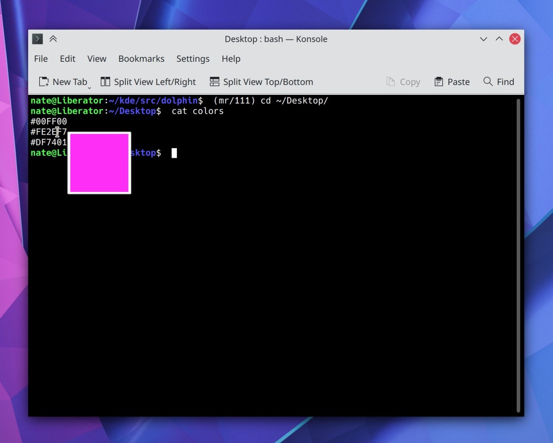 Kate now has a new off-by-default but very cool plugin that will visualize colors for various textual color codes, and let you edit them graphically using the standard systemwide color picker! (Jan Paul Batrina, Kate 21.04):