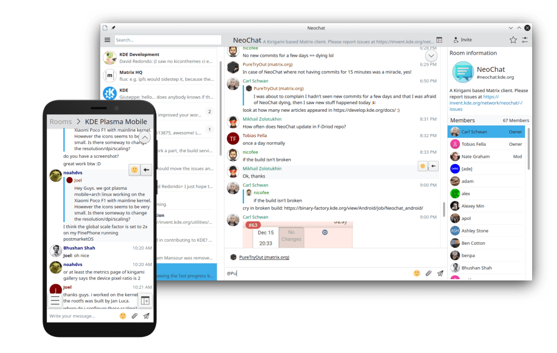 That’s not all: we have a new KDE Matrix-based chat app: NeoChat! This app is a fork of Spectral, which a few months ago appeared to have been abandoned by its developer. Carl Schwan and Tobias Fella decided to resurrect it as a KDE project, and they’ve done a smashing job bringing it into the fold. In addition to being a very nice desktop app, it also runs on Plasma mobile and there are early Android builds. I’ve been using it for the last month, and even in an early beta state, I already like it better than Element and every other Matrix client I’ve tried. Check out the official release announcement here: https://carlschwan.eu/2020/12/23/announcing-neochat-1.0-the-kde-matrix-client/