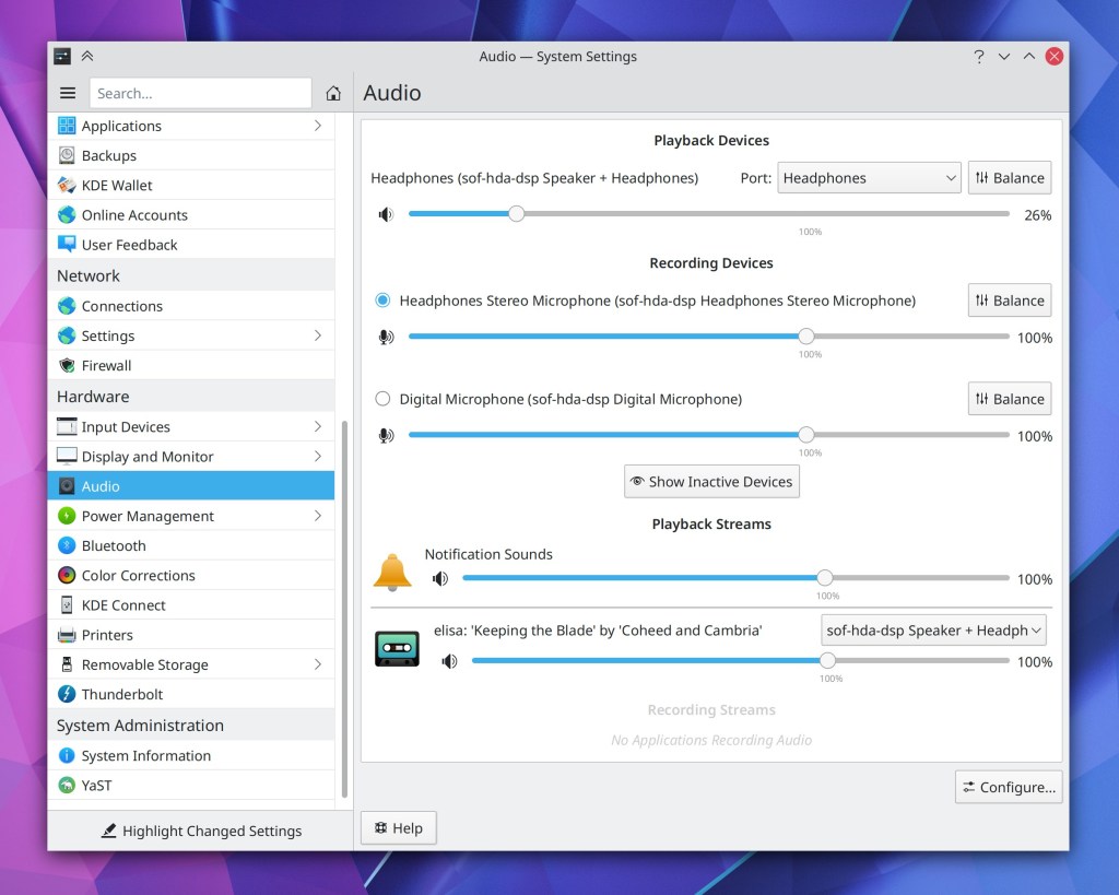 The System Settings Audio Volume now has a fancy new layout that’s much simpler and dispenses with the multi-tab view (Nicolas Fella, Plasma 5.21):