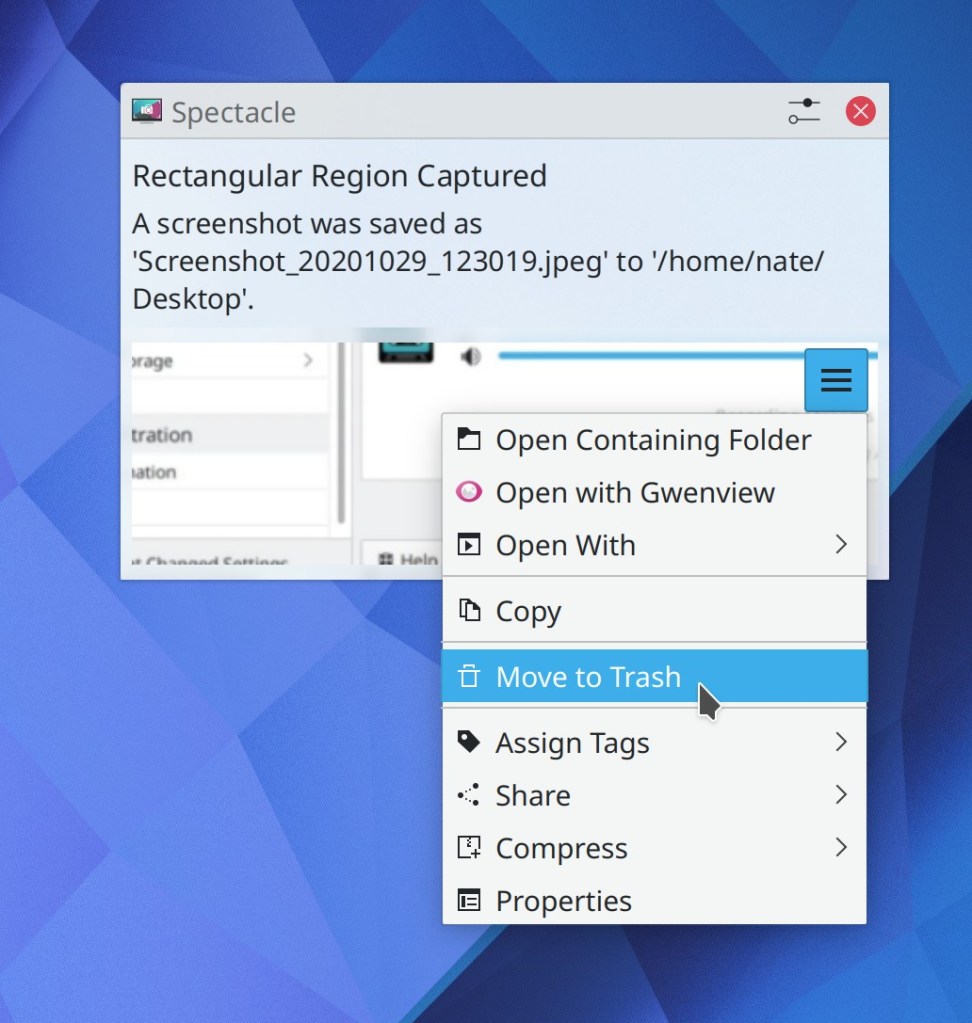 The context menu for file-based notifications now includes a “Move to Trash” item just in case you suddenly realize you don’t need the file after all (Kai Uwe Broulik, Plasma 5.21):