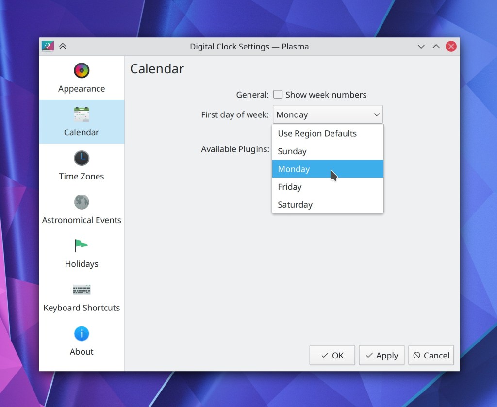 There’s now an option to change the first day of the week in the Digital Clock’s calendar popup (Kai Uwe Broulik, Plasma 5.21)