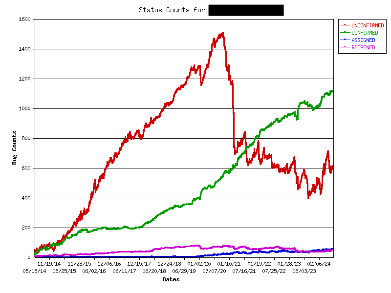 See how the number of CONFIRMED reports rises gradually over time, and the number of UNCONFIRMED reports falls in a choppy fashion — indicating new reports being opened and then closed within a few days. But sometimes the number of UNCONFIRMED reports go up for a few weeks, corresponding to times when the developers who do bug triage were too busy or on vacation — highlighting the impact just one or two people can have.