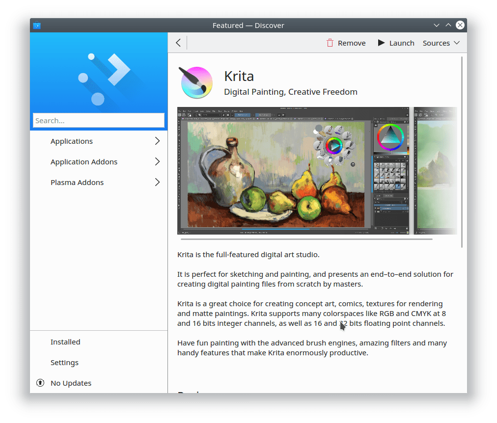 - Discover now shows transactions’ command-line output when using Arch Linux (Aleix Pol, KDE Plasma 5.13.0)